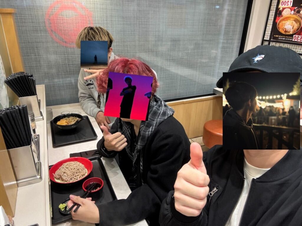 なんだかんだここまで3時間歩いてきた3人。疲れた身体に出汁の旨味が染み渡ります。深夜なのもありあまり重いものを食べると良くない気がするので、そばという選択は割と正解だったのかもしれません。