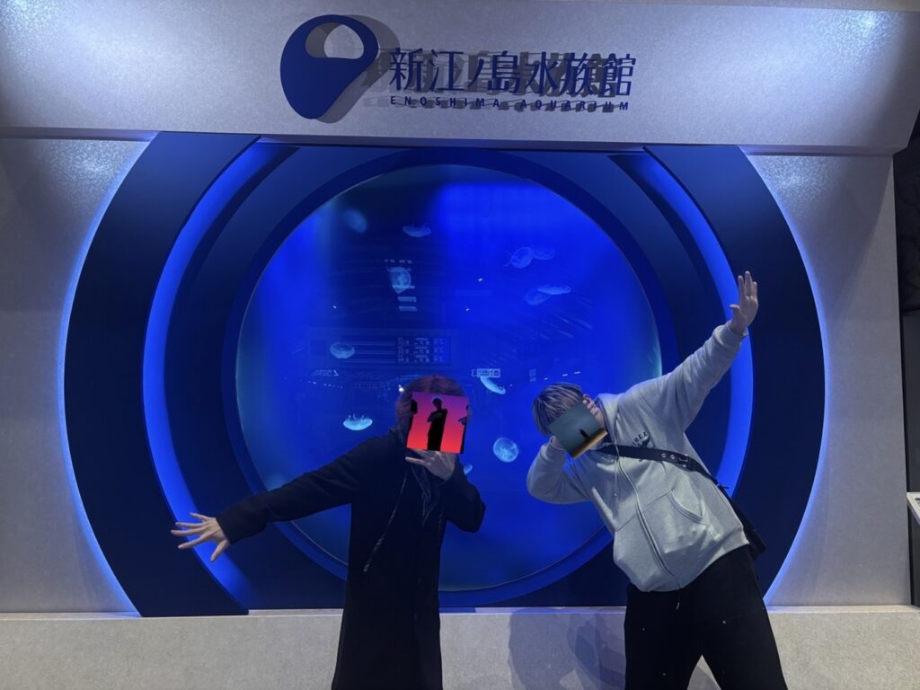 序盤で紹介した本物のクラゲが泳ぐ水槽です。これから新江ノ島水族館を訪れる観光客にとってはテンションの上がる光景となるはずですが、ボロボロな我々は水槽の前で変なポーズをとることしかできませんでした。