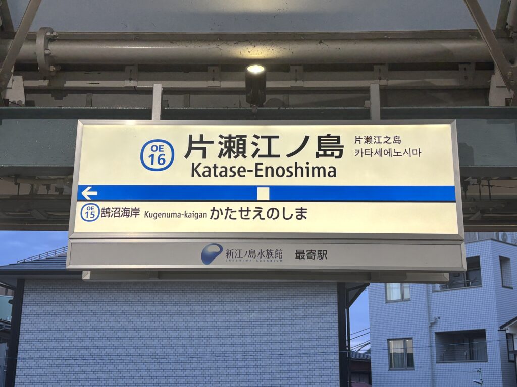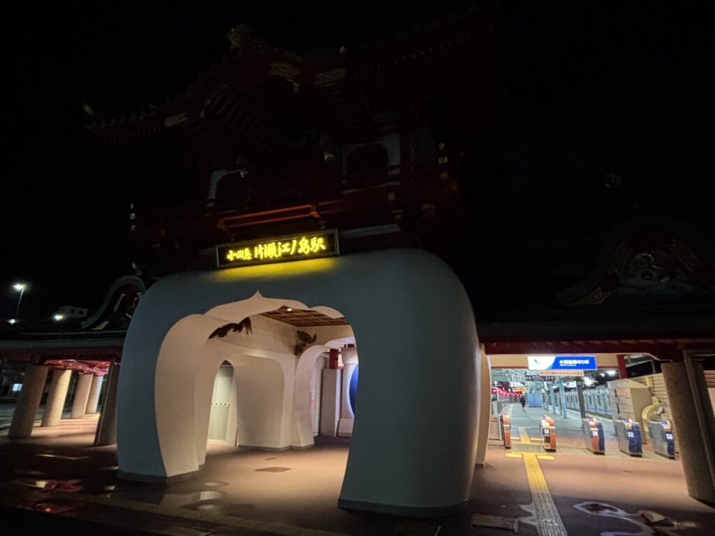 ついにこの企画の最終目的地、片瀬江ノ島(かたせえのしま)に到着。藤沢からは川沿いを歩いたので、間にある本鵠沼(ほんくげぬま)・鵠沼海岸(くげぬまかいがん)は経由しませんでしたが、地図なしでもちゃんと辿り着くことができました。江の島のランドマーク的存在である駅舎を目の前にし、えげつない達成感を噛みしめます。