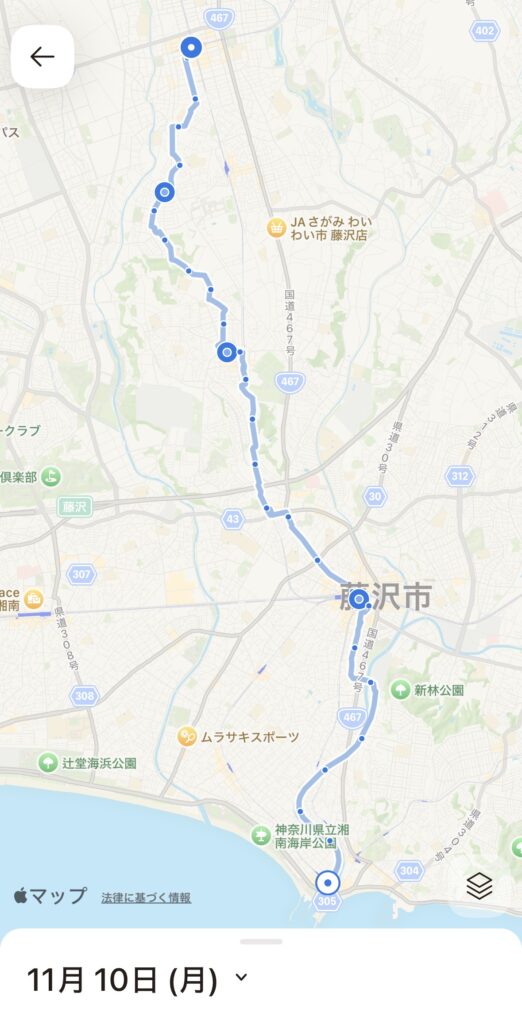 かかった時間は4時間25分、日付が変わってから歩いた歩数は20102歩、総移動距離は12.548kmでした。GPSのログを見ると、多少の迂回はあるものの、思ってた以上にまっすぐ南下できていたことが分かります。