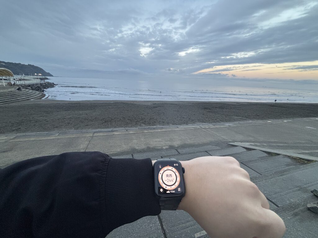 神奈川県民なので江の島の海がどちらを向いているかなんてもちろん知っているのですが、徹夜で4時間半歩いてきたので頭が回らず、てっきり海からの日の出が見れるもんだと思っていました。ずっと南西の方を眺めていた我々がバカみたいです。そのことに気づいて東を見てみますが……