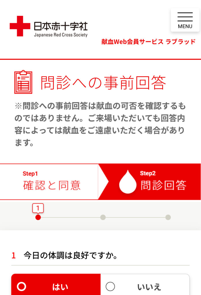 予約ができたら先に問診も済ませておくと良いでしょう。この問診では、献血当日の健康状態や病歴、海外渡航歴など、自分に関する様々なことを聞かれます。ここはしっかり正直に答えておきましょう。問診は献血ルームで回答することもできますが、事前にラブラッド上で回答しておくとスムーズです。