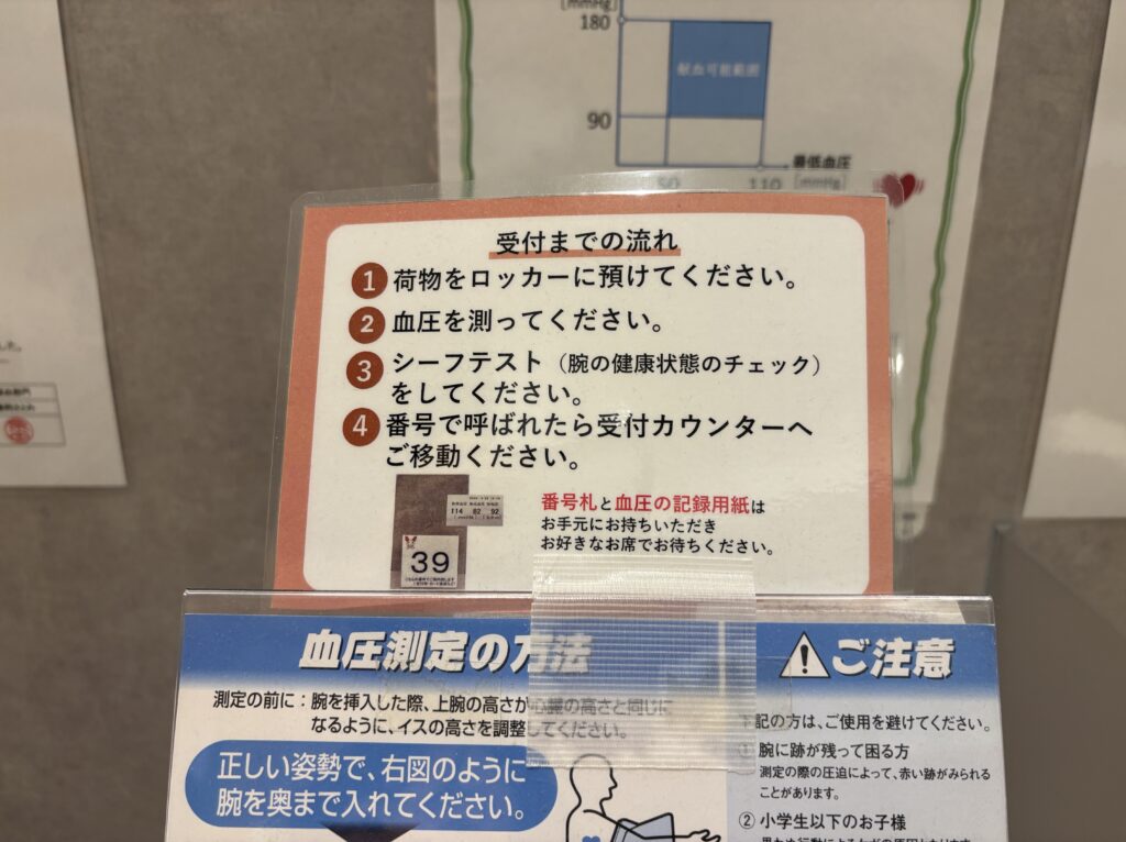 シーフテストを終えたら、もう一度受付があります。ここで体重測定と問診、事前回答している場合は回答内容の確認があります。また、献血者コードと生体認証で本人確認があります。初めての人はここで諸々の会員登録をします。